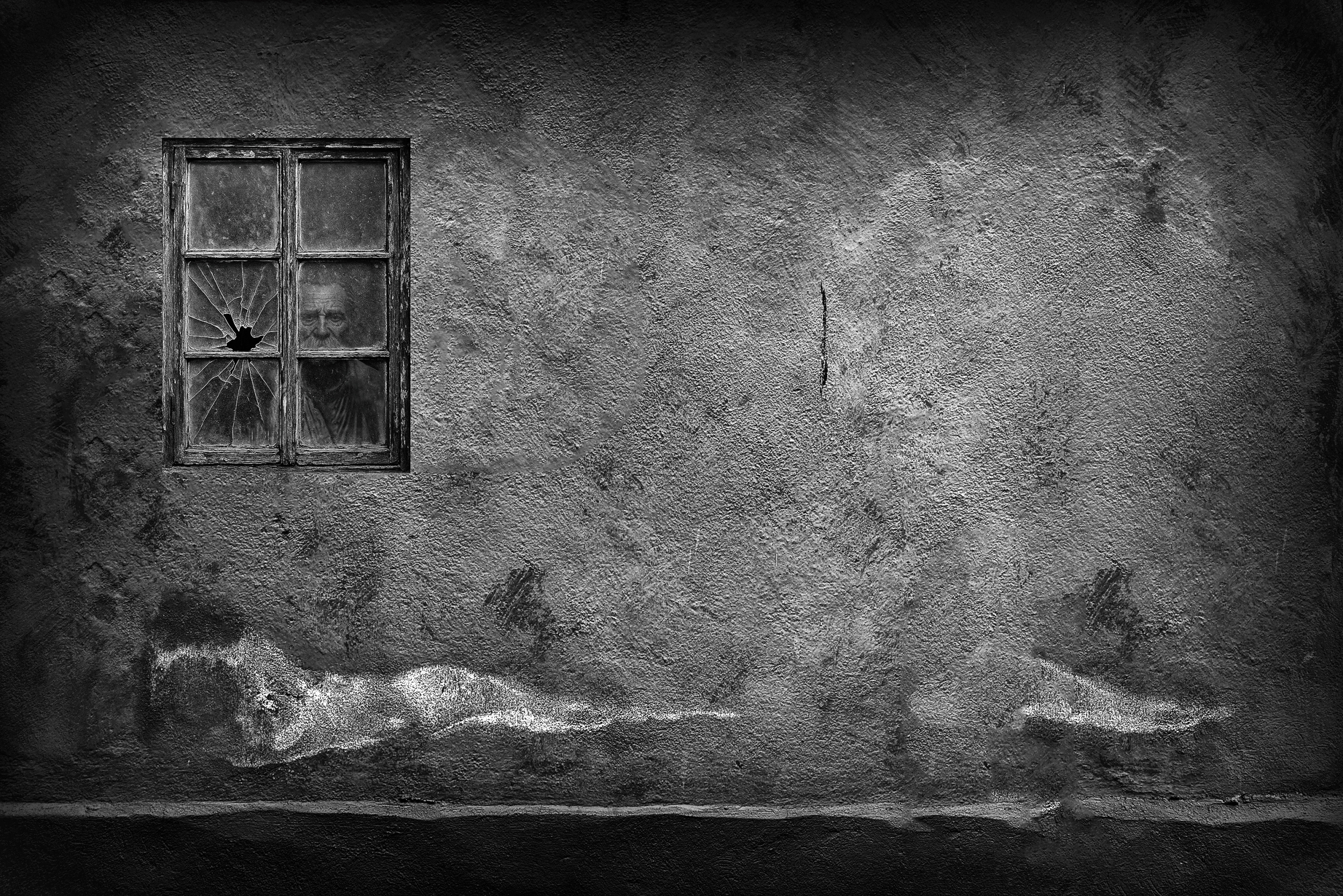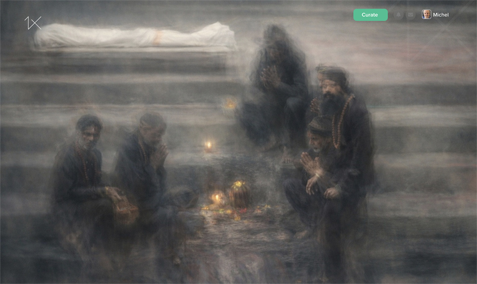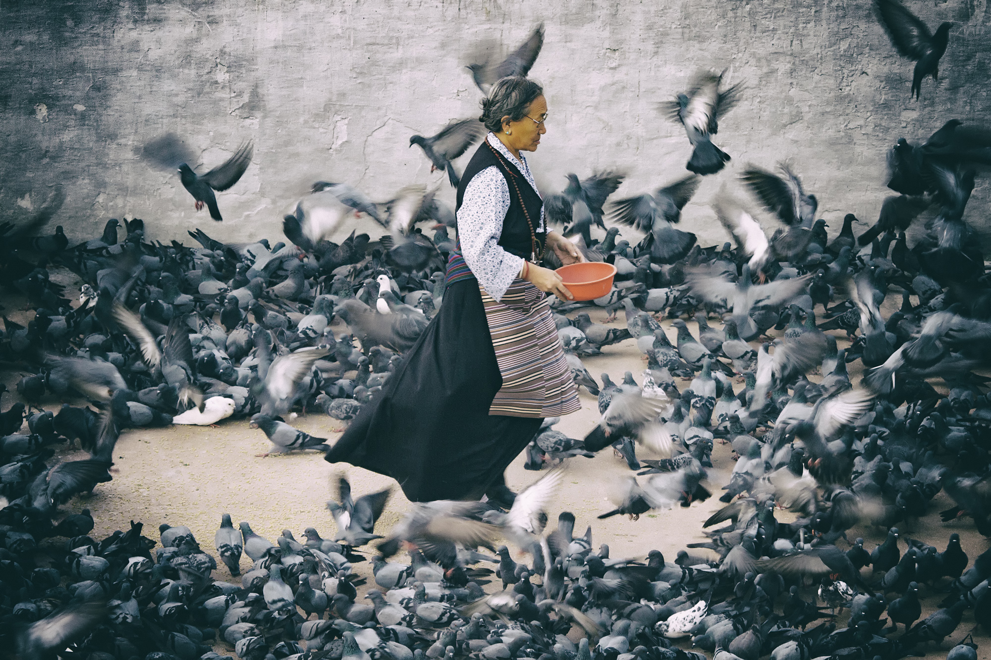 The original photo was taken in Kathmandu, Nepal, in the subject's natural environment. No artificial light was used. The first square was clear and documentary in nature, but the atmosphere was created during the editing process.
